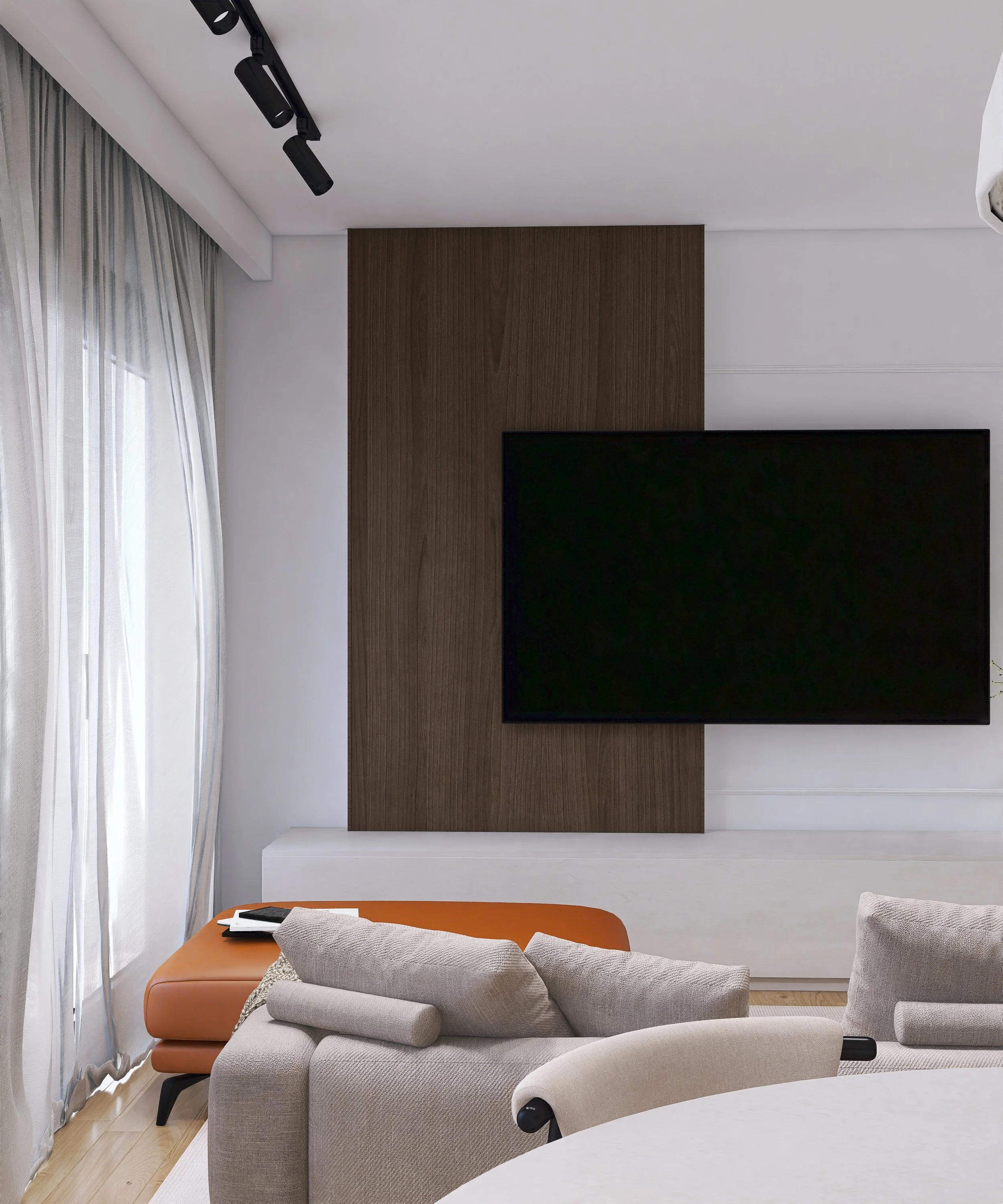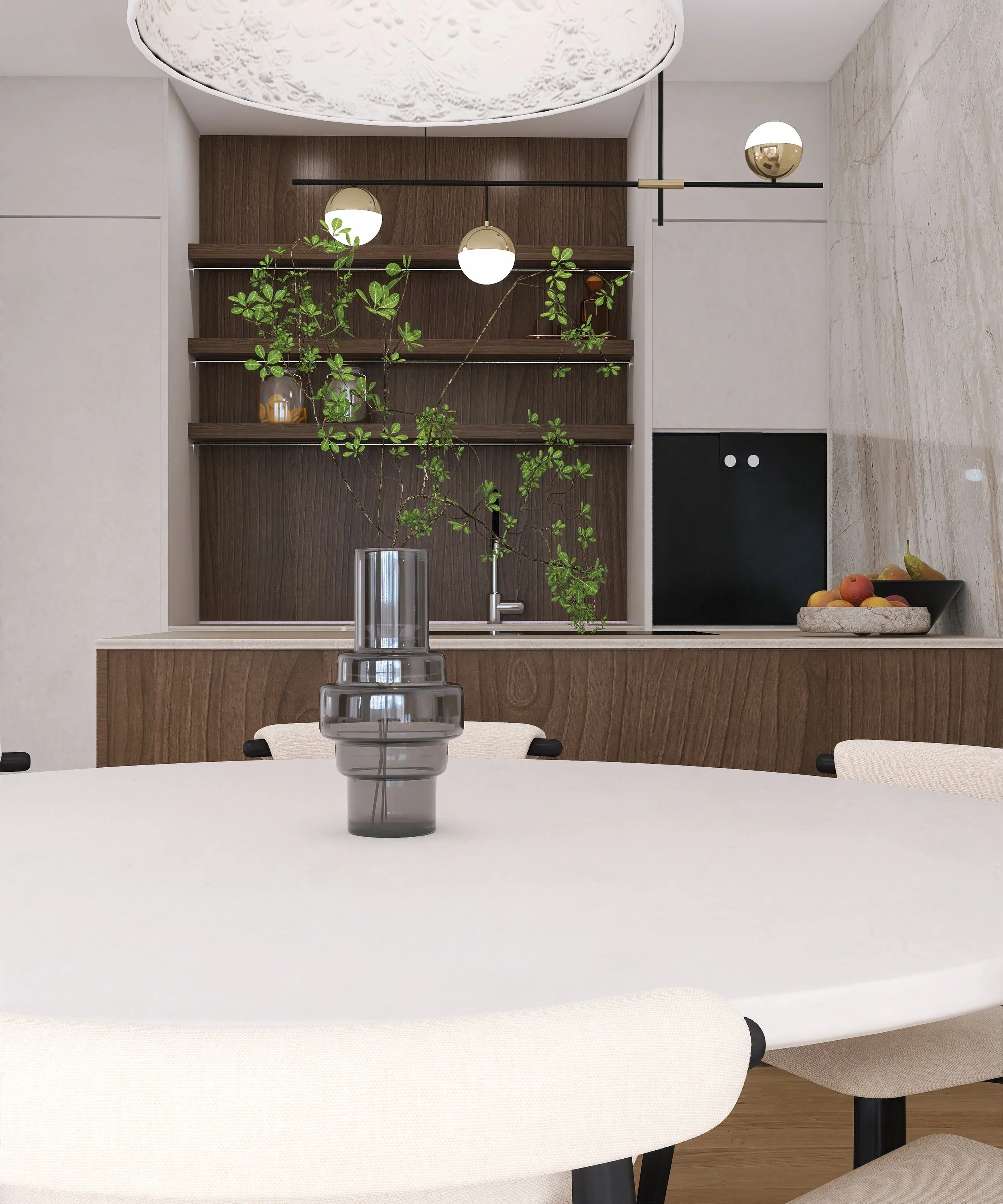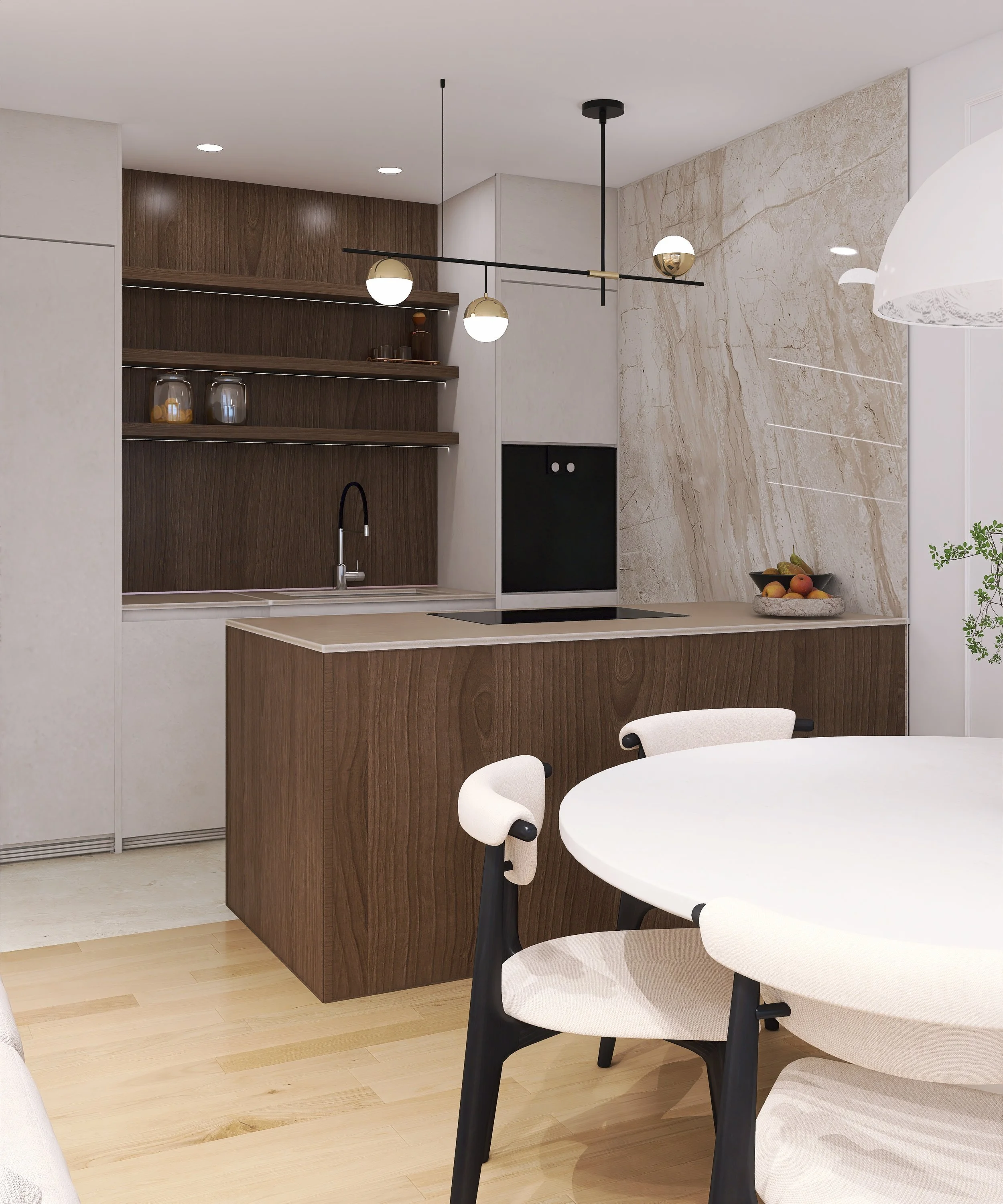 Svaki kutak ispunjen je pažljivo odabranim materijalima koji pričaju svoje priče, dok tonovi stvaraju umirujuću atmosferu. Održava se sklad između funkcionalnosti i estetske privlačnosti, pružajući prostor koji zrači mirnoćom i harmonijom.